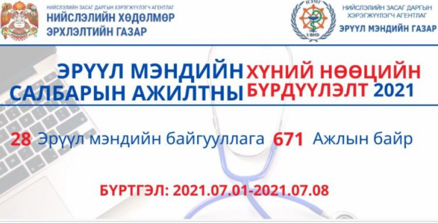 Нийслэлийн Хөдөлмөр эрхлэлтийн газар нь эрүүл мэндийн салбарын ажиллах хүчний хүний нөөцийн бүрдүүлэлтийг 2021 оны долдугаар сарын 1-8-ны хугацаанд зохион байгуулж байна. Эрүүл мэндийн 28 байгууллагад 671 ажлын байрыг нээлттэй зарлалаа.