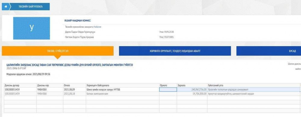 Дээрх байгууллагын данс руу мөн 2021 оны 07 дугаар сарын 08-ний өдөр “Урлаг соёлын салбар хороо дундын санхүүжилт” нэрээр 400 сая, урлагийн тоглолтын үлдэгдэл гэсэн утгатай 250 орчим сая төгрөгийн гүйлгээг хийжээ.