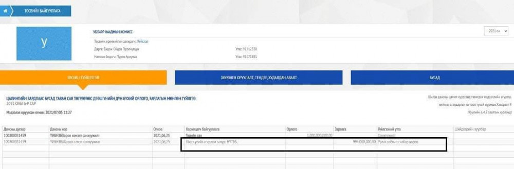 Гэтэл Нийслэлийн засаг дарга Д.Сумъябазар А/503 тоот захирамжаар үндэсний их баяр наадмыг зохион байгуулах хороонд 2021.6.23-ны өдөр нэмэлт санхүүжилт гэсэн утгаар НЭГ ТЭРБУМ төгрөгийн гүйлгээг ШИНЭ ҮЕИЙН НЭГДМЭЛ ЗАЛУУС-НҮТББ-руу шилжүүлсэн байна.